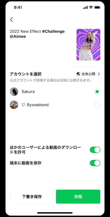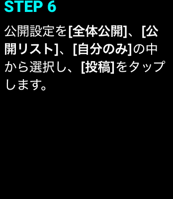 ※LINEアカウントでも投稿頂けます。※公式アカウントと連携している場合は、どのアカウントで投稿するか選択できます。※LINE VOOMの設定が完了していない場合、[全体公開]しか選択することができません。